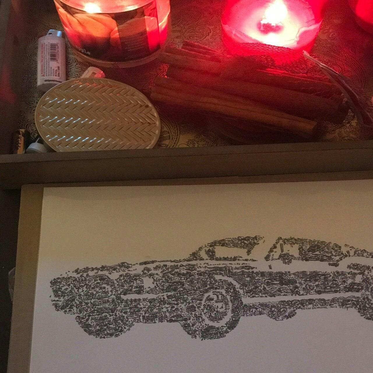 A portrait of the Ford Mustang with doodles inside the print. Plenty of details about the Fastback model :