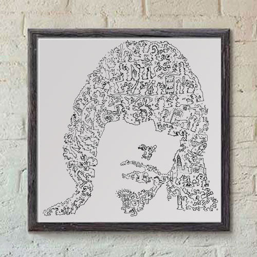 A print of Johnny Ramone from the Ramones with doodle details inside the picture: from New York, playing baseball, his love for military order, the powerful sound of his guitar play, his aggressivity, stealing the wife of Joey, the N.R.A & KKK...