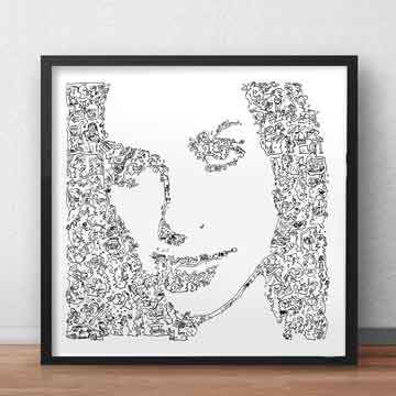 An original portrait of Alanis Morissette, made of little drawings biography doodles related inside the print. If you get closer, you will see plenty of details about the Canadian Singer :