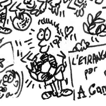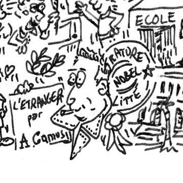 The whole picture is made of little drawings, based on the story "the first man" and when you put alltogether ans stepback, it makes the picture of a football player leg of the 30's with a vintage soccer ball (the kind of equipment Albert Camus used to have to play soccer) !