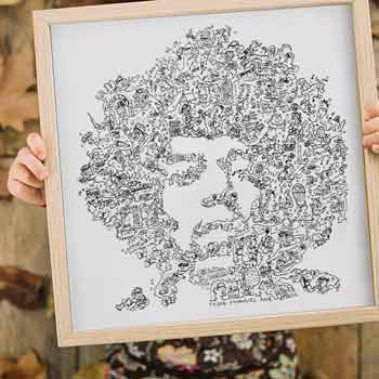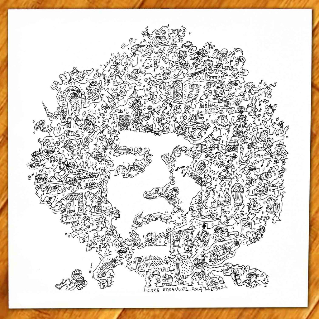 A portrait of Jimi Hendrix with doodles inside the print. Plenty of details about the voodoo child :