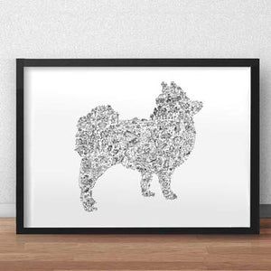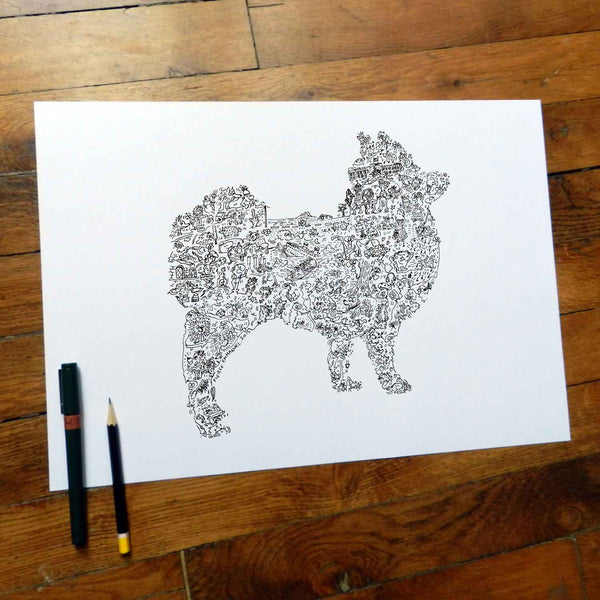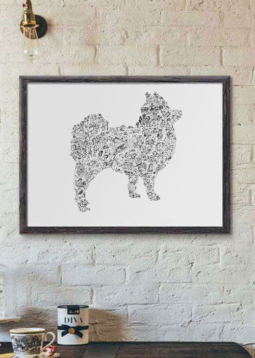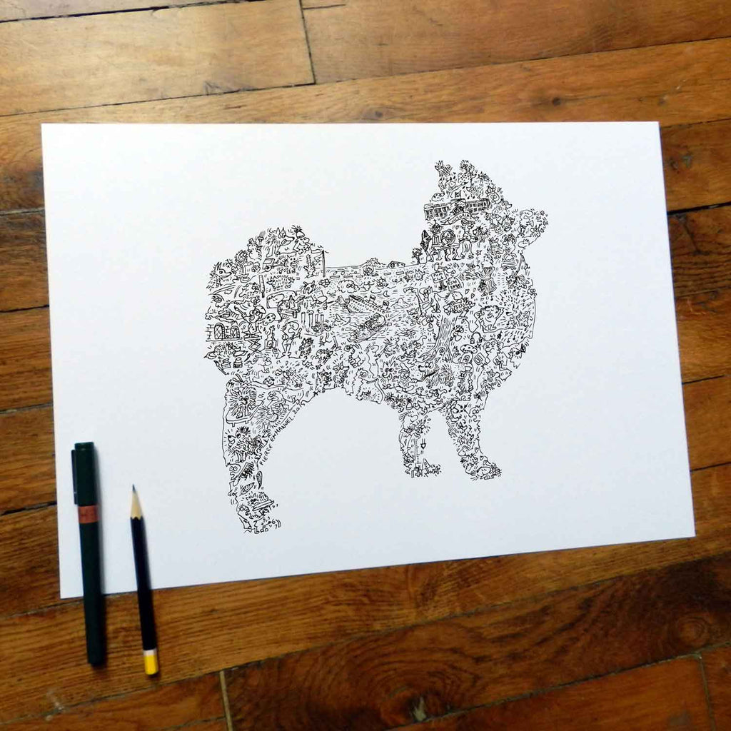 A portrait of the Pomeranian dog with doodles inside the print. Plenty of details about the Spitz :
