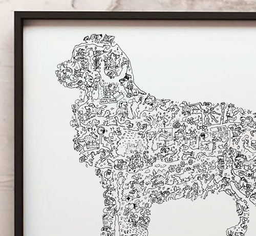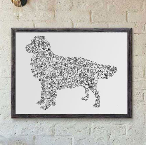 A portrait of the Golden Retriever with doodles inside the print. Plenty of details about the Breed :