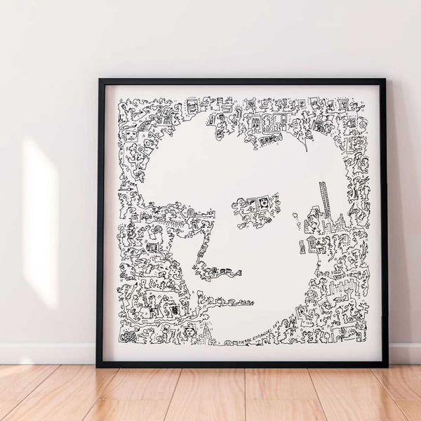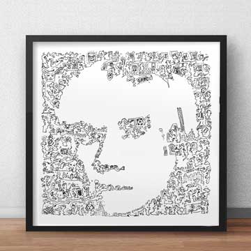 A portrait of Andy Warhol, the Pop Art creator with details of his life inside the doodles, featuring :