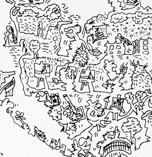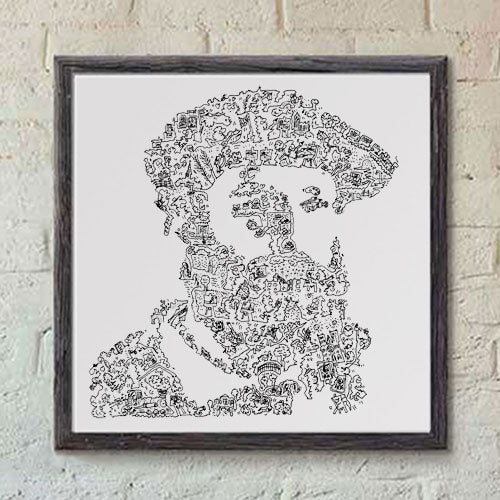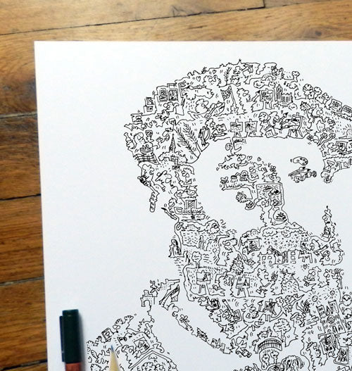 A portrait of Claude Monet with doodles inside the print. Plenty of details about the french painter : the plein air painting, famous for his poppy field, "impression soleil levant", poplars, the Rouen cathedral paintings serie, with friends, having a lunch on the grass.