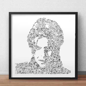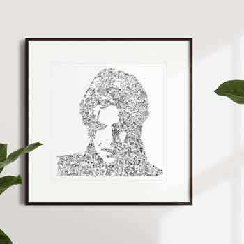 A portrait of David Bowie with details inside the print. Plenty of details about Ziggy Stardust :