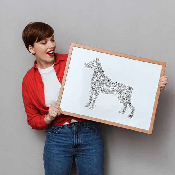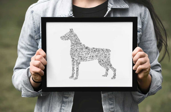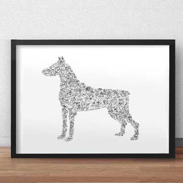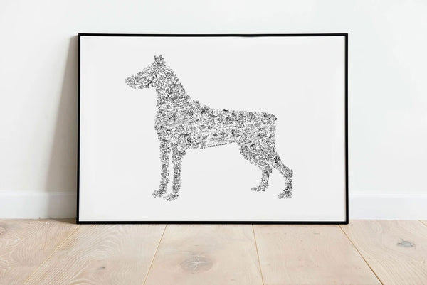 A portrait of the Dobermann pinscher with doodles inside the print. Plenty of details about the dog breed :