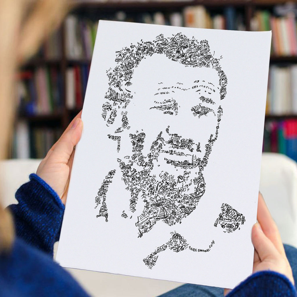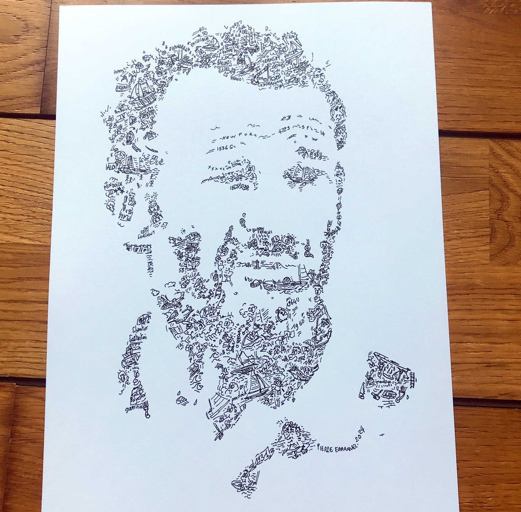 The whole picture is the portrait of french skipper and the inside is made of little drawings. Have a closer look to his boat and you will see plenty of details about the Pen Duick boats sailor :