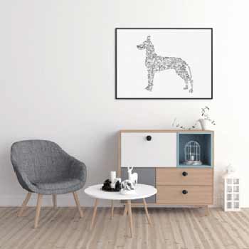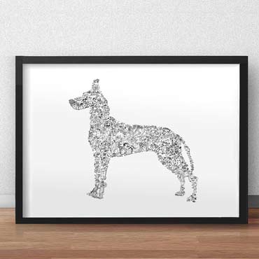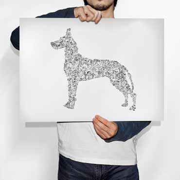 A portrait of the Great Dane with doodles inside the print. Plenty of details about the great and Noble dog wich is very tall, the tallest actually :