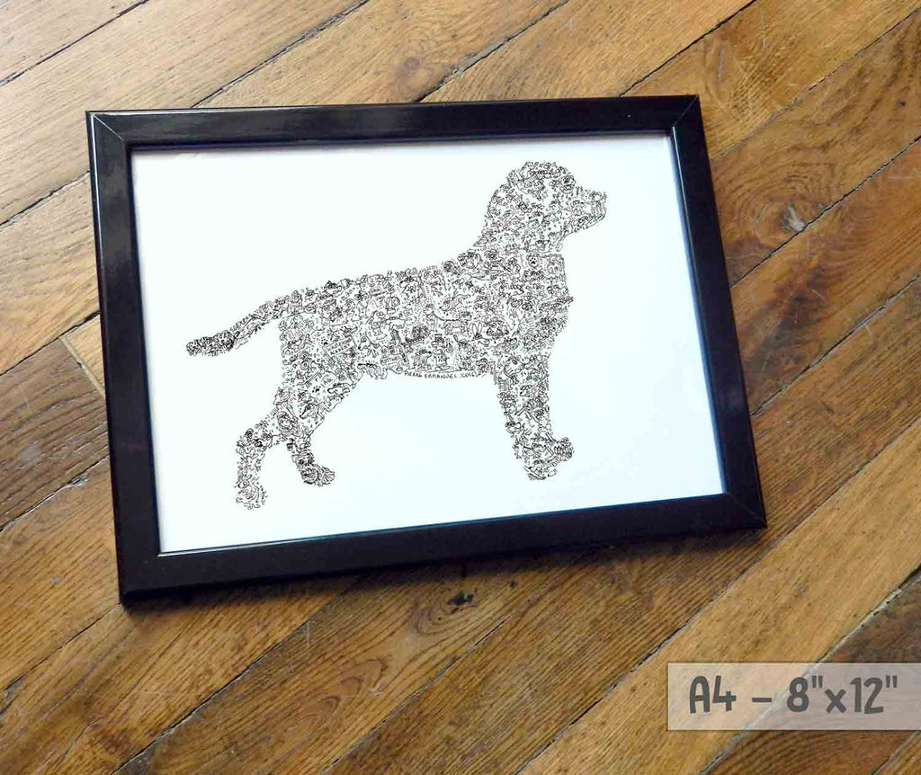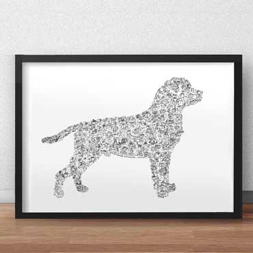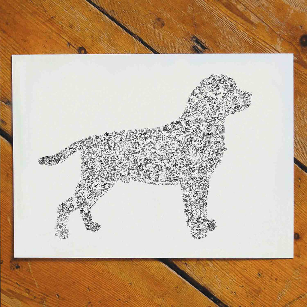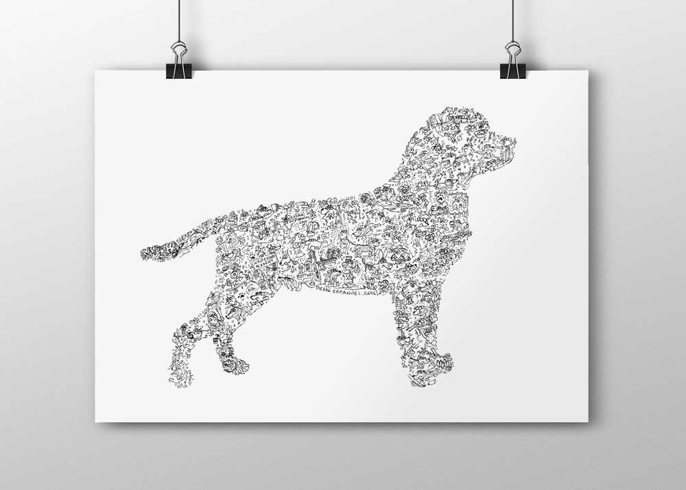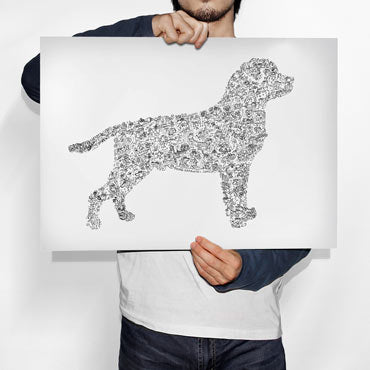 A print of the Rottweiler dog (with long tail) drawn with plenty of fun facts details inside the print. the main picture is made of doodles drawings about the dog, it's story and all related to the dog from Rottweil, Germany. Have a closer look and you will find :